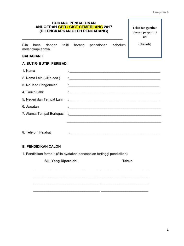 Lampiran B Borang Pencalonan Anugerah Gpb Gict Pdf